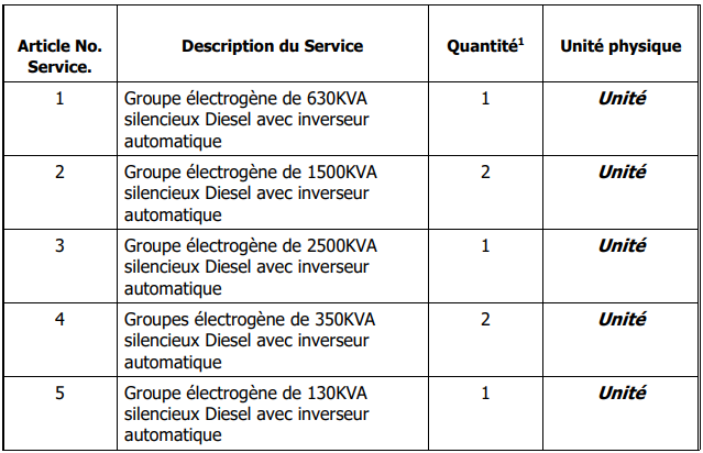 3. Le Projet d’Urgence sur la Résilience Urbaine au Burundi « PRU » sollicite des offres fermées de la part de soumissionnaires éligibles et répondant aux qualifications requises pour la fourniture et l’installation de Sept (7) Groupes Electrogènes dont la nature et la liste est décrite dans le tableau ci-dessous :
