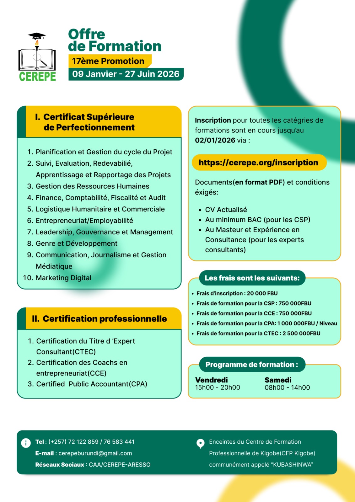 Le Centre de Recherche et de Perfectionnement (CEREPE) a le plaisir d’annoncer le lancement des inscriptions pour sa 17ᵉ promotion de formation professionnelle et de perfectionnement. Ces formations visent à renforcer les compétences techniques, le leadership et l’employabilité des participants, leur offrant des outils concrets pour exceller dans leur parcours professionnel.