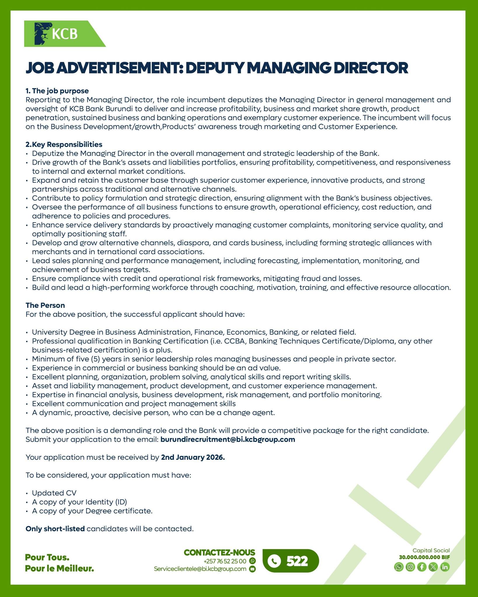 Relevant du Directeur général, le titulaire du poste supplée le Directeur général dans la direction générale et la supervision de KCB Bank Burundi pour assurer et augmenter la rentabilité, la croissance des activités et des parts de marché, la pénétration des produits, les opérations commerciales et bancaires soutenues et une expérience client exemplaire. Le titulaire du poste se concentrera sur le développement/progression des affaires, la notoriété des produits à travers le marketing et l'expérience client.