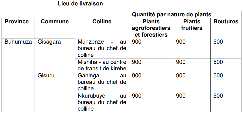 La livraison desdits plants et boutures se fera aux sites indiqués dans le tableau ci-dessous et une visite des pépinières du/des fournisseurs gagnants sera organiser pour la vérification et le choix des échantillons.