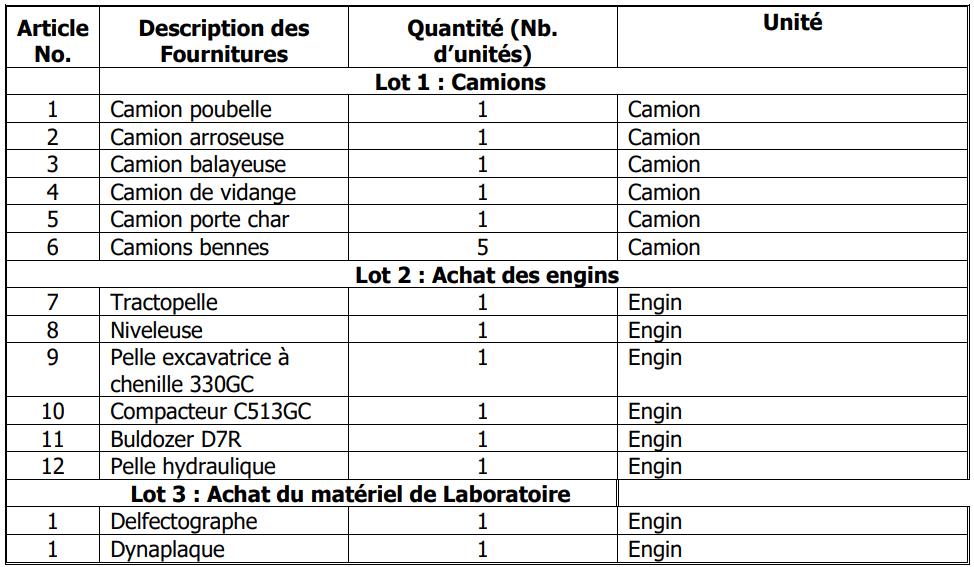 2. Le Projet d’Urgence sur la Résilience Urbaine au Burundi « PRU » invite, par le présent avis, les Soumissionnaires à présenter leurs Offres sous pli fermé, pour la fourniture des engins dont la nature et la liste est décrite dans le tableau ci-dessous :