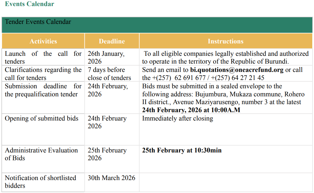 Interested and eligible bidders may express their interest by submitting all the required documents listed under the eligibility criteria above in a sealed envelope to the above address or through the OAF procurement team via email: bi.quotations@oneacrefund.org from 26th January 2026.