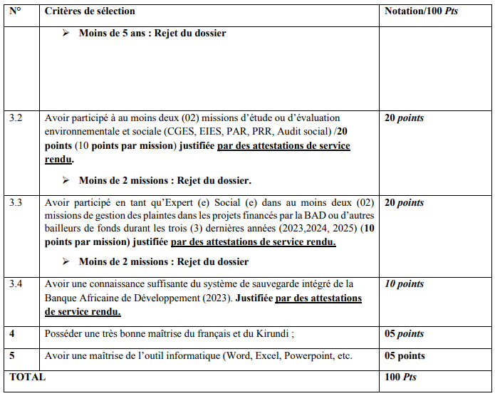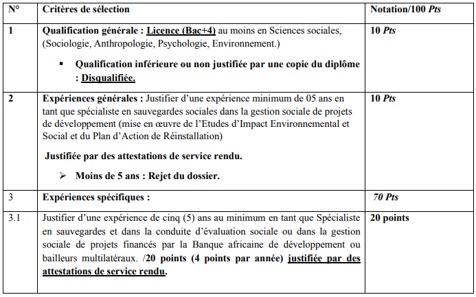 Le score minimum requis pour être sélectionné est de 70 points sur 100. Le/la candidat(e) classé(e) premier(e) dont la note totale est égale ou supérieure au score minimum ci-avant cité sera invité(e) à négocier un contrat après Avis de Non Objection (ANO) sur le rapport de présélection.